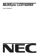 TCO’95 TCO’95 demand requires that plastic components weighing more than 25 grams must not contain organically bound chlorine and bromine. MultiSync LCD1920NX Black Model Congratulations! You have just purchased a TCO’95 approved and labeled product! Your choice has provided you with a product developed for professional use. Your purchase has also contributed to reducing the burden on the environment and also, to the further development of environmentally adapted electronics products.