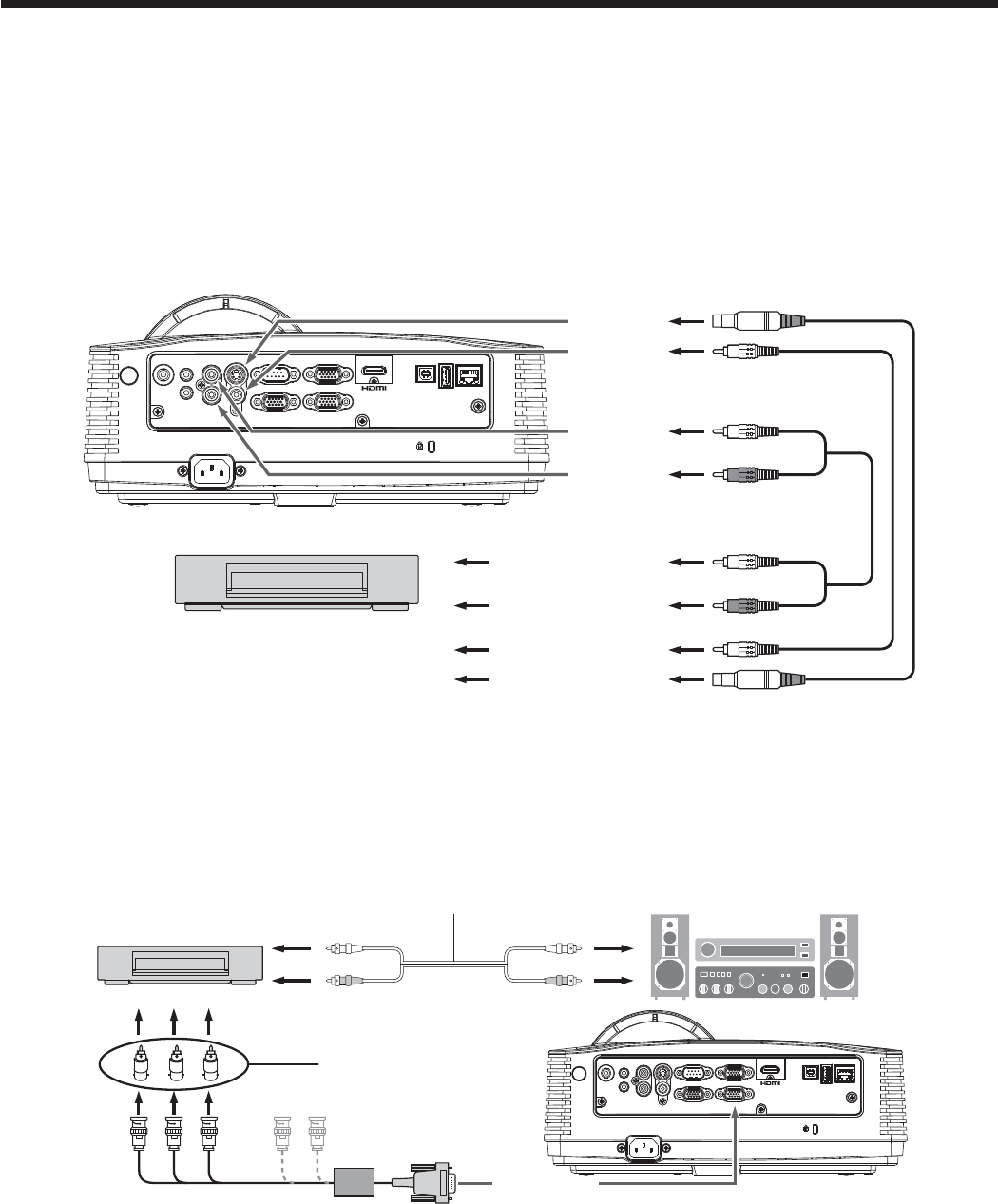 This projector can be connected with various devices such as a VCR, video camera, videodisc player, and personal