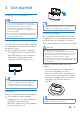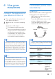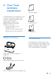 2 Your True wireless earphones Congratulations on your purchase, and welcome to Philips! To fully benefit from the support that Philips offers, register your product at www.philips.com/welcome. With this Philips True wireless earphones, you can: • enjoy convenient wireless handsfree calls; • enjoy and control wireless music; • switch between calls and music. Quick start guide Global Warranty Safety leaflet What's in the box Other devices A mobile phone or device (e.g.