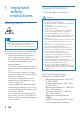 Contents 1 Important safety instructions 2 Hearing Safety General information 2 2 2 Your Bluetooth over-ear headphones What's in the box Other devices Overview of your Bluetooth wireless headset 3 Get started Charge the battery Pair the headphones with your mobile phone 4 Use your headphones Connect the headphones to a Bluetooth device Manage your calls and music 3 3 3 4 5 5 5 6 6 6 5 Technical data 8 6 Notice 9 Declaration of conformity Disposal of your old product and battery Remove the int