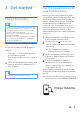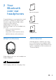 2 Your Bluetooth over-ear headphones Congratulations on your purchase, and welcome to Philips! To fully benefit from the support that Philips offers, register your product at www.philips.com/support. With this Philips over-ear headphones, you can: • enjoy convenient wireless handsfree calls; • enjoy and control wireless music; • switch between calls and music. What's in the box Quick start guide Global Warranty Safety leaflet Other devices A mobile phone or device (e.g.