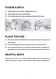 POWER SUPPLY (1) Confirm the correct power supply before use. (2) Insert the plug into the outlet firmly. (3) Do not disconnect the power plug by pulling on the cord. PLACE FOR USE (1) Because the machine distributes hot air, please don’t place or operate in a narrow place. (2) In case of dangerous leak, don’t work the machine in a humid place. (3) Don’ t place the machine in a sunlit corner otherwise the unit might shut down due to the overheat and the color of the machine may soon fade out.