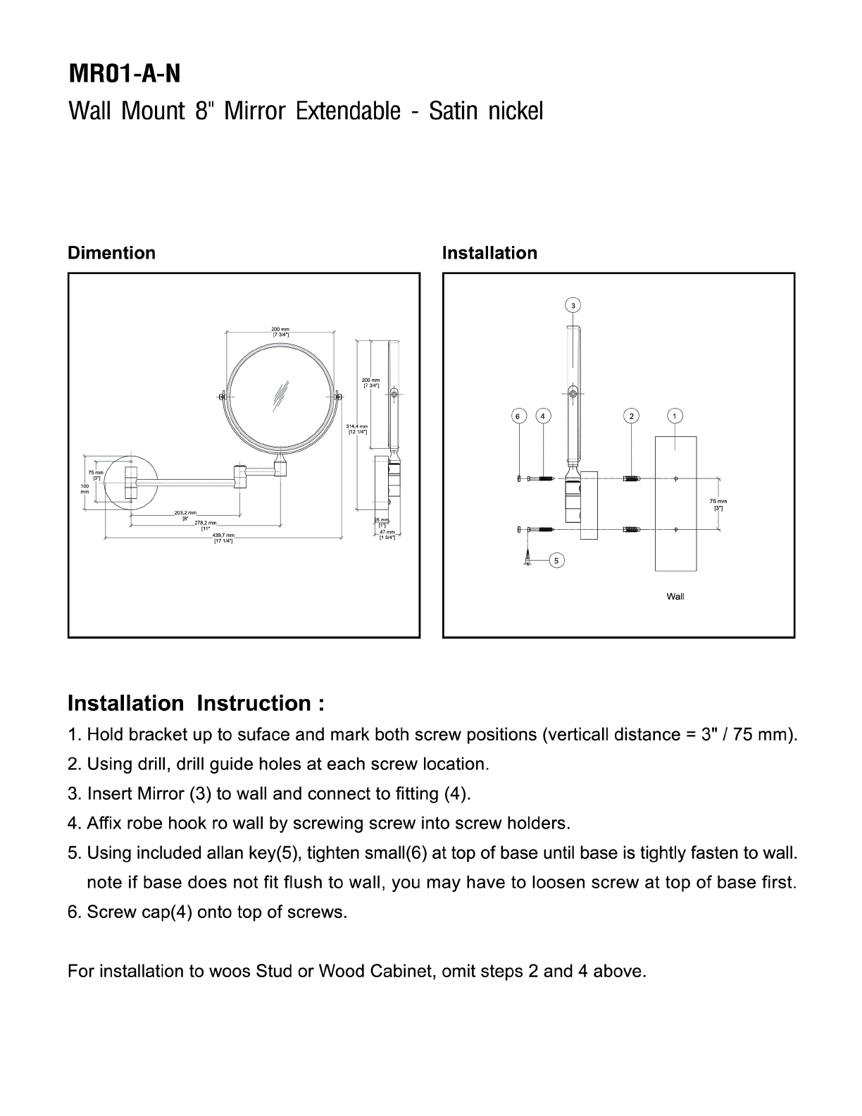 MORO-A-N Wall Mount 8" Mirror Extendable Satin nickel Di mention Installation 15 Walt Installation Instruction : 1. Hold bracket up to surface and mark both screw positions {vertical distance = 3"/ 75 mm). 2. Using drill, drill guide holes at each screw location. 3. Insert Mir rot {3) to wall amid connect to fitting (4). 4. Affix robe hook ro wall by screwing screw into screw holders. 5. Using included Allan key(5), tighten small(8) at top of base until base is tightly fasten to wall.