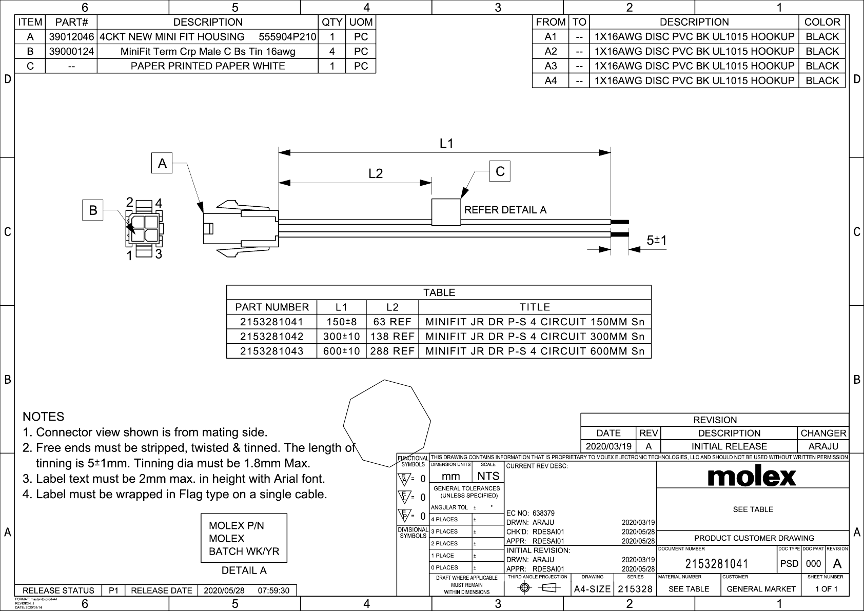 6 5 ITEM] PART# DESCRIPTION Qry[uom FROM[TO DESCRIPTION COLOR NEW MINI FIT HOUSING _ 555904P210] 1 | PC A1_| — | 1X16AWG DISC PVC BK UL1015 HOOKUP | BLACK _ Mini Fit Term Crp Male C Bs Tin 16awg 4 [ PC AZ — | 1X16AWG DISC PVC BK UL1015 HOOKUP | BLACK C PAPER PRINTED PAPER WHITE 1 | pC A3_| — | 1X16AWG DISC PVC BK UL1015 HOOKUP | BLACK A4_| — | IX16AWG DISC PVC BK UL1015 HOOKUP | BLACK REFER DETAIL TABLE PART NUMBER L1 L2 TITLE — 2153281041 150:8 | 63 REF | MINI FIT CIRCUIT 150MM Sn 2153281042 | 300210 | 138