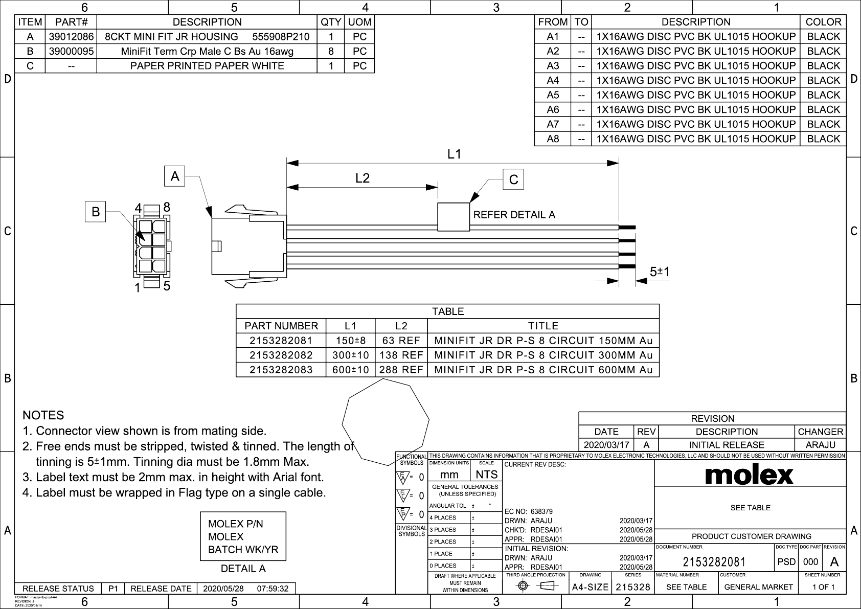 6 5 ITEM| PART# DESCRIPTION QTY|UOM FROM|TO DESCRIPTION COLOR A [39012086| TUCK MINI FIT JR HOUSING 555808P210 [1X16AWG DISC PVC BK UL1015 HOOKUP | BLACK B | Mini Fit Term Crp Male C Bs Au 16awg 1X16AWG DISC PVC BK UL1015 HOOKUP | BLACK c PAPER PRINTED PAPER WHITE [1X16AWG DISC PVC BK UL1015 HOOKUP | BLACK 1X16AWG DISC PVC BK UL1015 HOOKUP | BLACK 1X16AWG DISC PVC BK UL1015 HOOKUP | BLACK 1X18AWG DISC PVC BK UL1015 HOOKUP | BLACK A7 | — [1X16AWG DISC PVC BK UL1015 HOOKUP | BLACK 1X16AWG DISC PVC BK UL1015 H