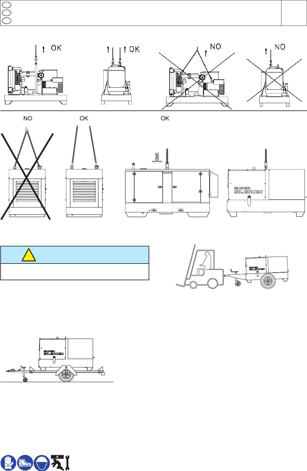 DO NOT TOW the generating set without trailer, be