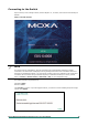 5. The console will prompt you to log in. The default login name is admin, and the default password is moxa. This password will be required to access any of the consoles (web, serial, Telnet). 6. After successfully connecting to the switch by serial console, users can start configuring the switch parameters by using command line instructions. Refer to the Moxa Command Line Interface Manual. NOTE By default, the password assigned to the Moxa switch is moxa.