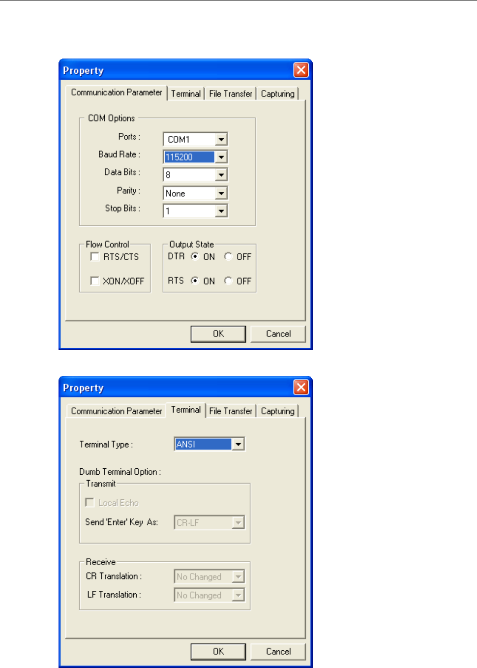 5. From the Property window’s Terminal page, select ANSI or VT100 for Terminal Type and then click OK.