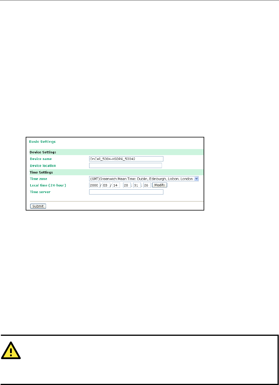 to the Local time field. Once you submit the new time, the OnCell 5000’s firmware will modify the GMT time