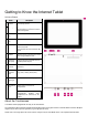 Getting to Know the Internet Tablet Unit at a Glance Name Description 1 Camera Front-facing camera 2 Back key Press to return to the previous screen. If the keyboard is on the screen, press to close the keyboard. 3 Volume + key Press to increase the volume level. 4 Volume – key Press to decrease the volume level. 5 Power key Press to turn the unit on, or to turn the screen on and off. Press and hold to access the Power Off menu.