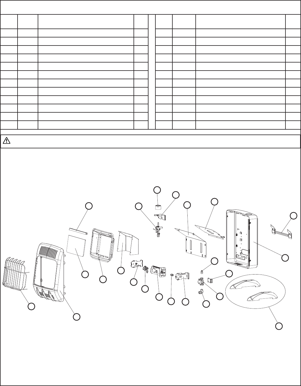 WARNING: Failure to position the parts in accordance with these diagrams or failure to use only parts specifi cally approved with this heater