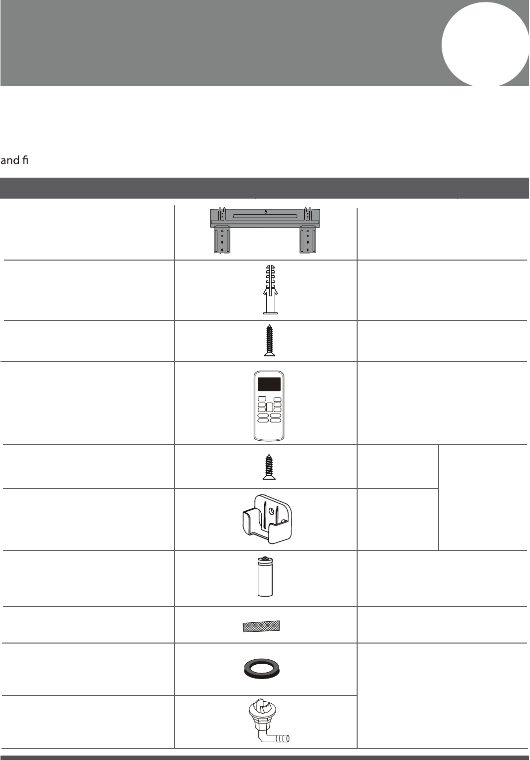 The air conditioning system includes the following accessories. Use all of the installation parts and