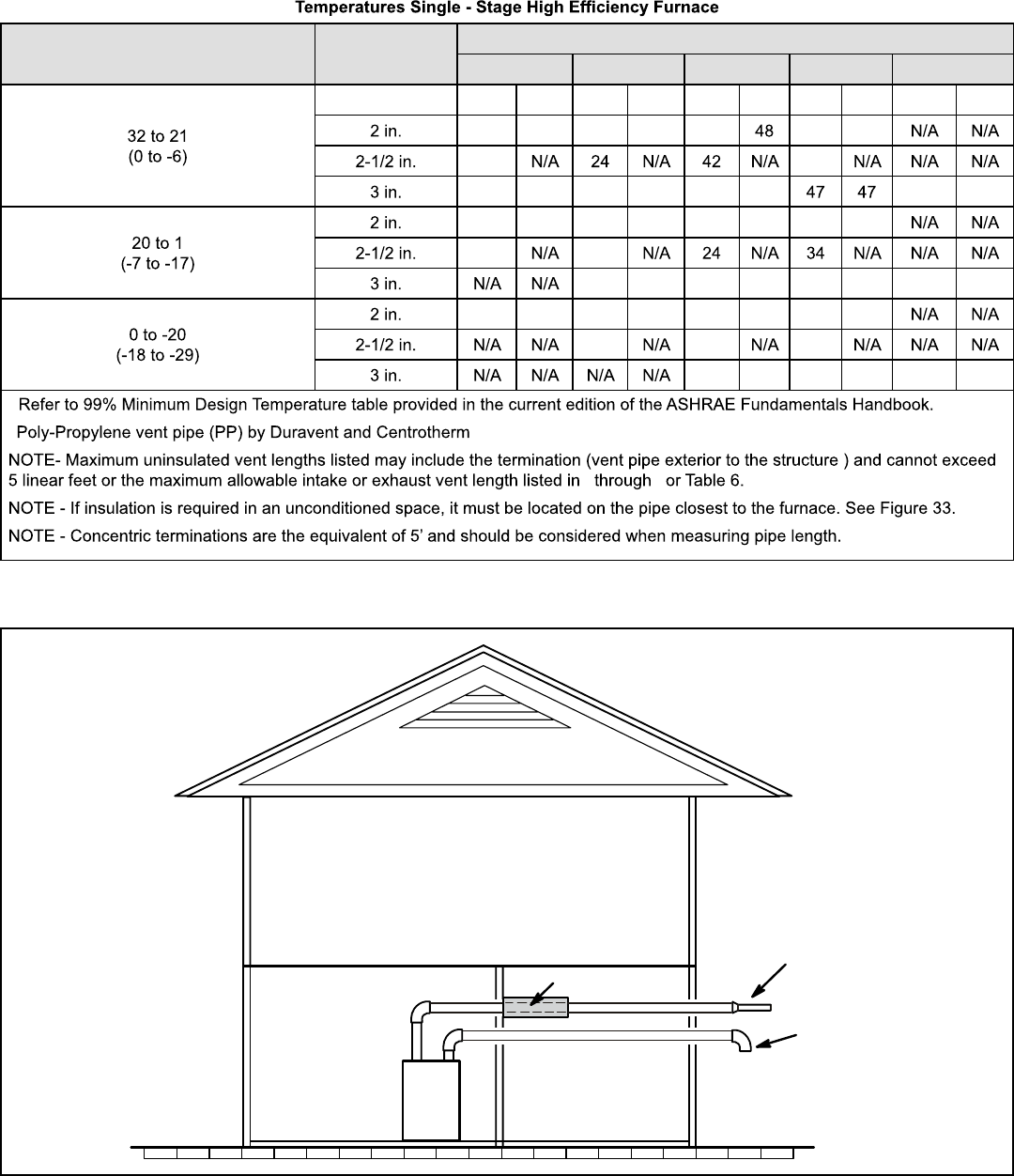 Maximum Allowable Exhaust Vent Pipe Length (in ft.) without Insulation in Unconditioned Space For Winter Design