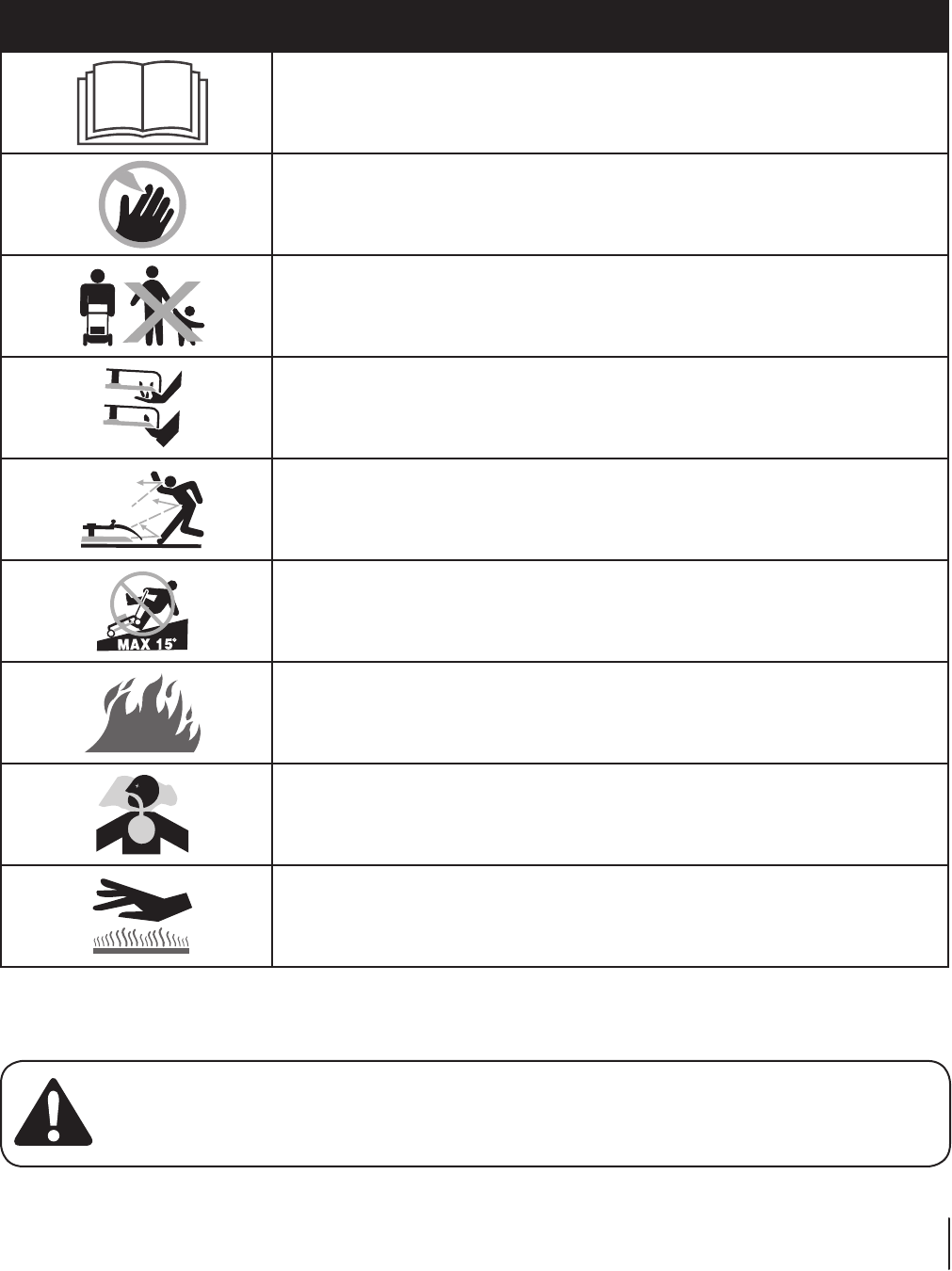 Tenga mucha precaución en pendientes. No siegue cuestas mayores que 15 °.
