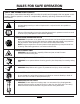 RULES FOR SAFE OPERATION The purpose of safety symbols is to attract your attention to possible dangers. The safety symbols and their explanations deserve your careful attention and understanding. The safety warnings do not, by themselves, eliminate any danger. The instructions or warnings they give are not substitutes for proper accident prevention measures. SYMBOL NOTE: MEANING SYMBOL MEANING SAFETY ALERT SYMBOL: Indicates danger, warning or caution.