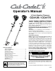 Operator’s Manual 4-Cycle Gasoline Trimmers CC4125 / CC4175 SAVE THESE INSTRUCTIONS For service call 1-877-282-8684 in the United States, or 1-800-668-1238 in Canada to obtain a list of authorized service dealers near you. For more details about your unit, visit our website at www.cubcadet.com. DO NOT RETURN THE UNIT TO THE RETAILER. PROOF OF PURCHASE WILL BE REQUIRED FOR WARRANTY SERVICE. THIS PRODUCT IS COVERED BY ONE OR MORE U.S. PATENTS. OTHER PATENTS PENDING.