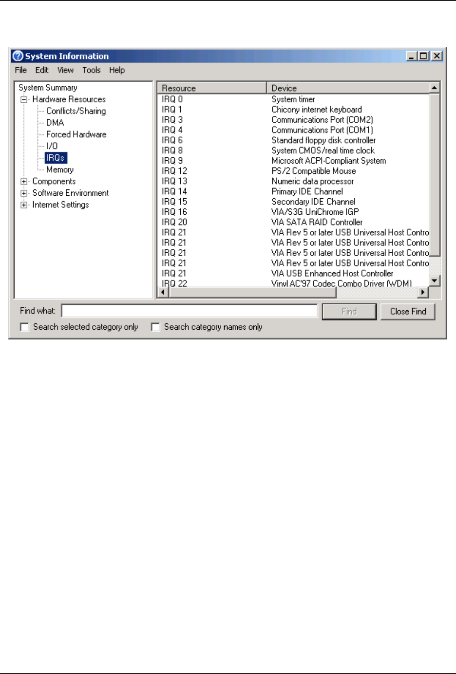 4. Click on IRQs to display the used IRQs.