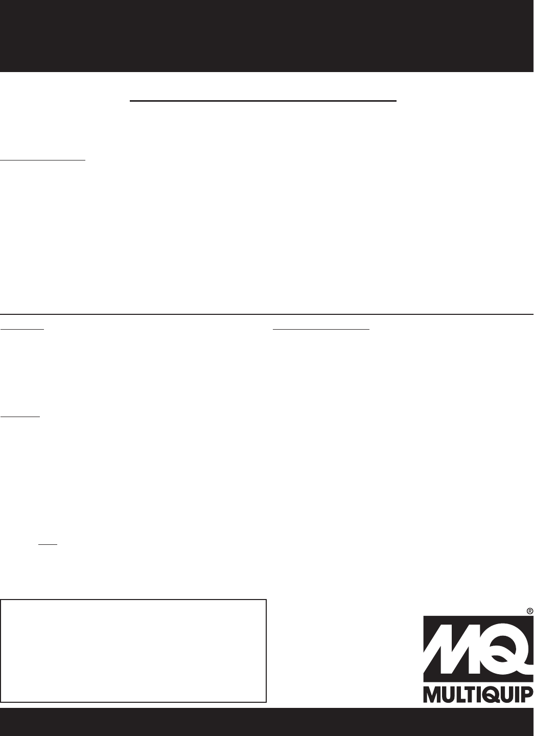 Multiquip Inc and the MQ logo are registered trademarks of Multiquip Inc. and may not be used, reproduced, or altered without written permission. All other trademarks are the property