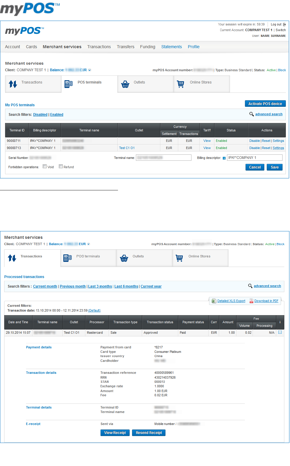 - myPOS management and myPOS e-money account