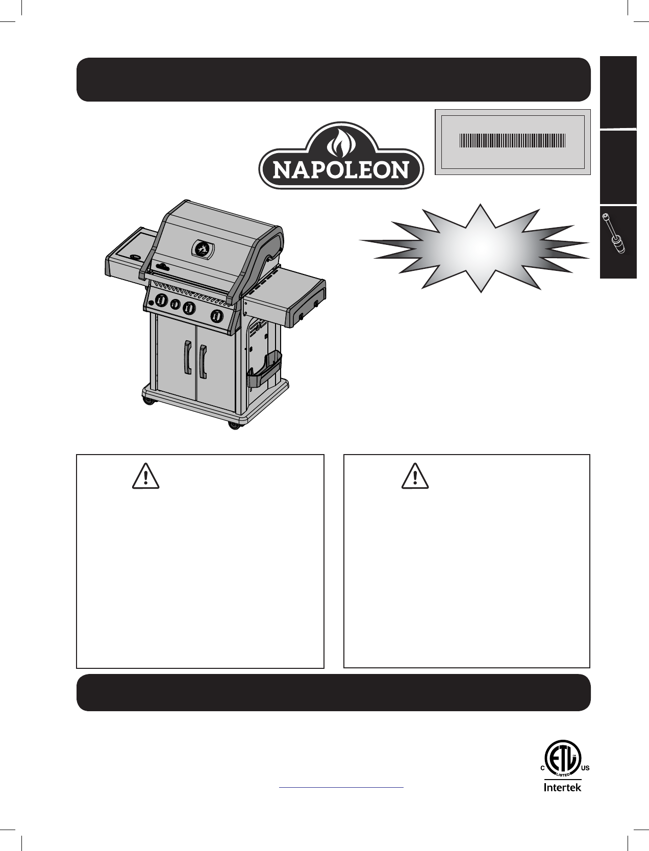 WARNING – FIRE HAZARD ATTENTION - RISQUE D’INCENDIE WARNING! Do not route hose underneath drip pan. AVERTISSEMENT! Ne pas passer le tuyau d’alimentation sous le tiroir d’égouttement afin de garder. X WARNING! Ensure the hose does not contact any high temperature surfaces, or it may melt and leak causing a fire. AVERTISSEMENT! Assurez-vous que le boyau ne touche à aucune surface à haute température sinon il risque de fondre, de provoquer une fuite et causer un feu. www.napoleongrills.