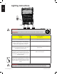 Lighting Instructions EN Side Burner Igniter Left Burner Centre Burner WARNING! Open lid. Right Burner Off Position WARNING! Ensure all burner controls are in the off position. Slowly turn on the gas supply valve. Main Burner Lighting Side Burner Lighting (if equipped) 1. Open grill lid 1. Open burner cover. 2. Push and turn any main burner knob slowly to the high position. If the pilot lights, continue to push down on the control knob until the burner lights and then release. 2.