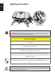 Lighting Instructions EN Burner Control ! Clip supplied lighting rod to regulator bracket. WARNING! Open lid WARNING! Ensure all burner controls are in the off position. slowly turn on the gas supply valve (large propane cylinder). Connect a disposable cylinder or Main Burner Lighting 1. Open grill lid 2. Push and turn any main burner control knob slowly to the ‘hi’ position. This action will ignite the selected burner. 3.