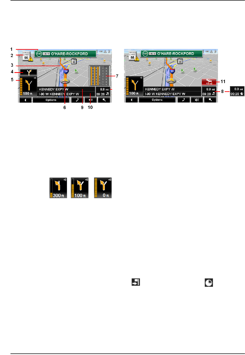 5. The large arrow shows a schematic depiction of the next maneuver. The remain-