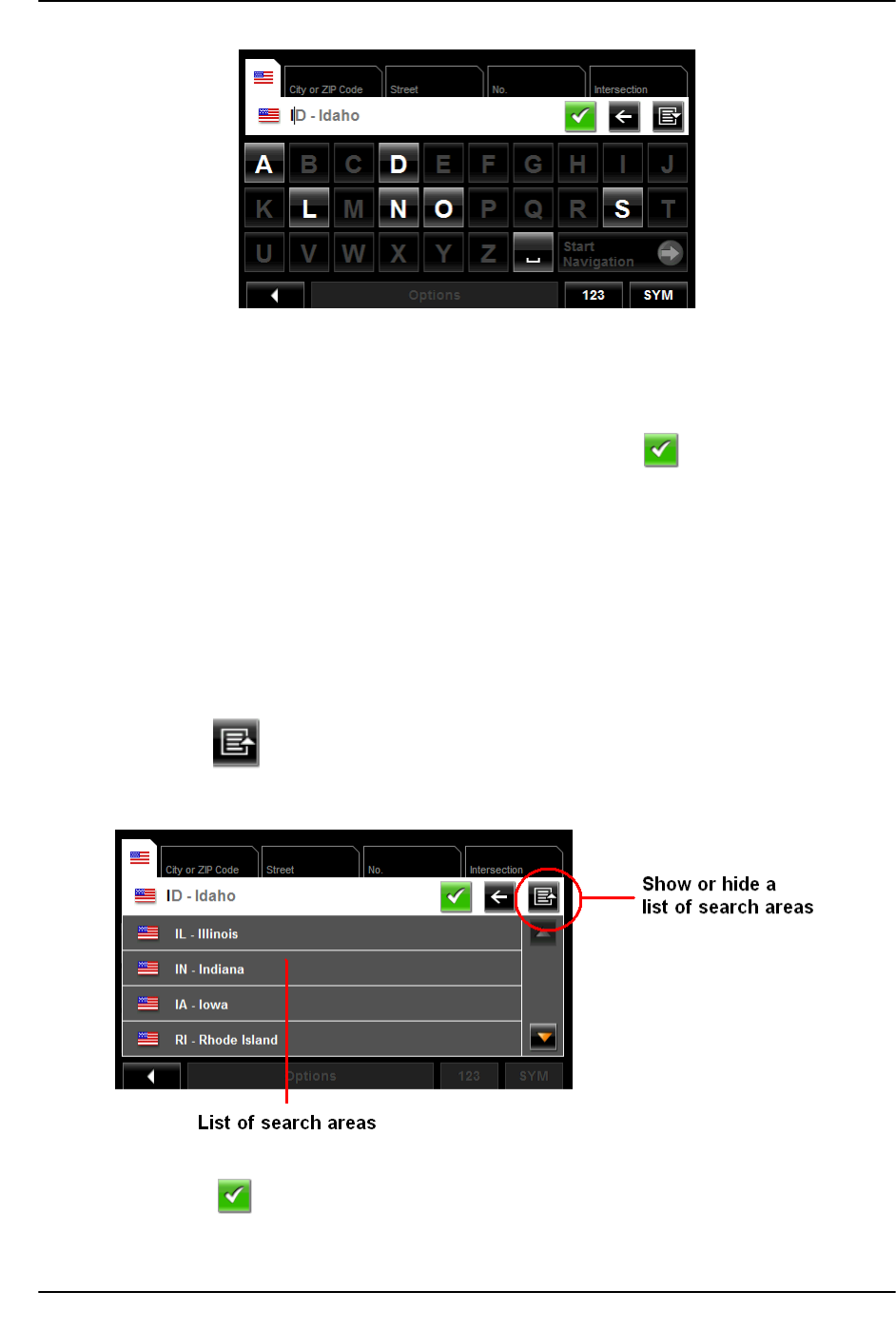 When you enter the New Destination button on the Main window, the SEARCH AREA key-