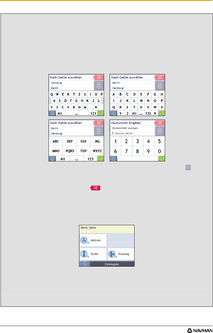 Auf dem Bildschirm Zieleingabe wählen Sie Ihr Fahrtziel nach Gebiet, Straße, PLZ, Sonderziel, Kreuzung, Ort,