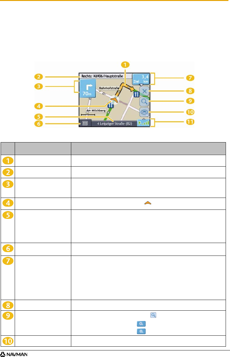 Umgebung an. Wenn eine Route berechnet wurde, werden Route und Abbiegungen hervorgehoben angezeigt. Der