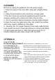 CLEANING Be sure to unplug the appliance from the power supply. 1. Clean the cavity of the oven after using with a slightly damp cloth. 2. Clean the accessories in the usual way in soapy water. 3. The door frame and seal and neighbouring parts must be cleaned carefully with a damp cloth when they are dirty. 4. Do not use harsh abrasive cleaners or sharp metal scrapers to clean the oven door glass since they can scratch the surface, which may result in shattering of the glass. 5.