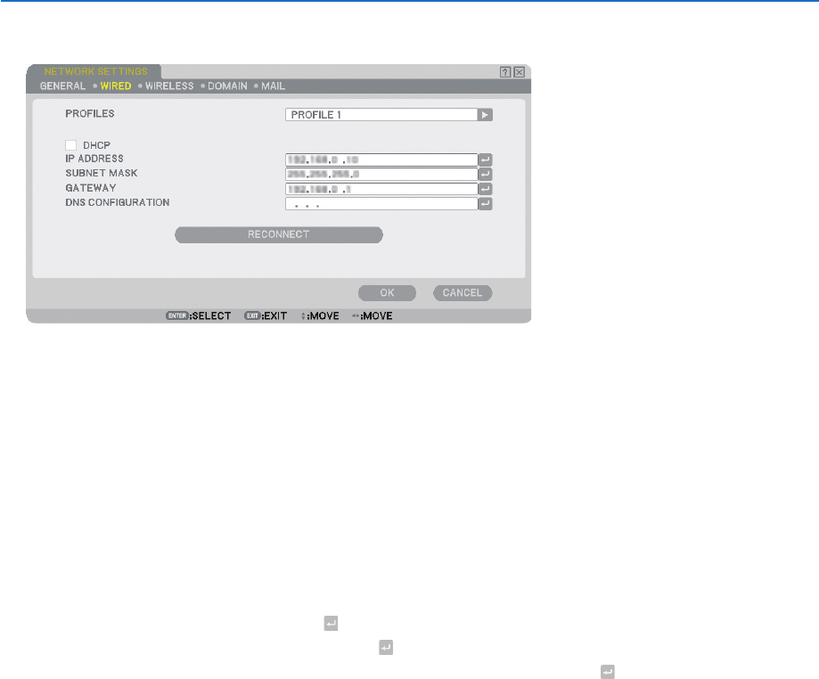 Select [PROFILE 1] or [PROFILE 2] and then do settings for [DHCP] and the other options.