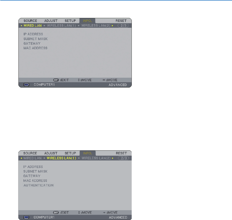 IP ADDRESS .......... Indicates the IP address of the projector when the LAN port (RJ-45) is used.