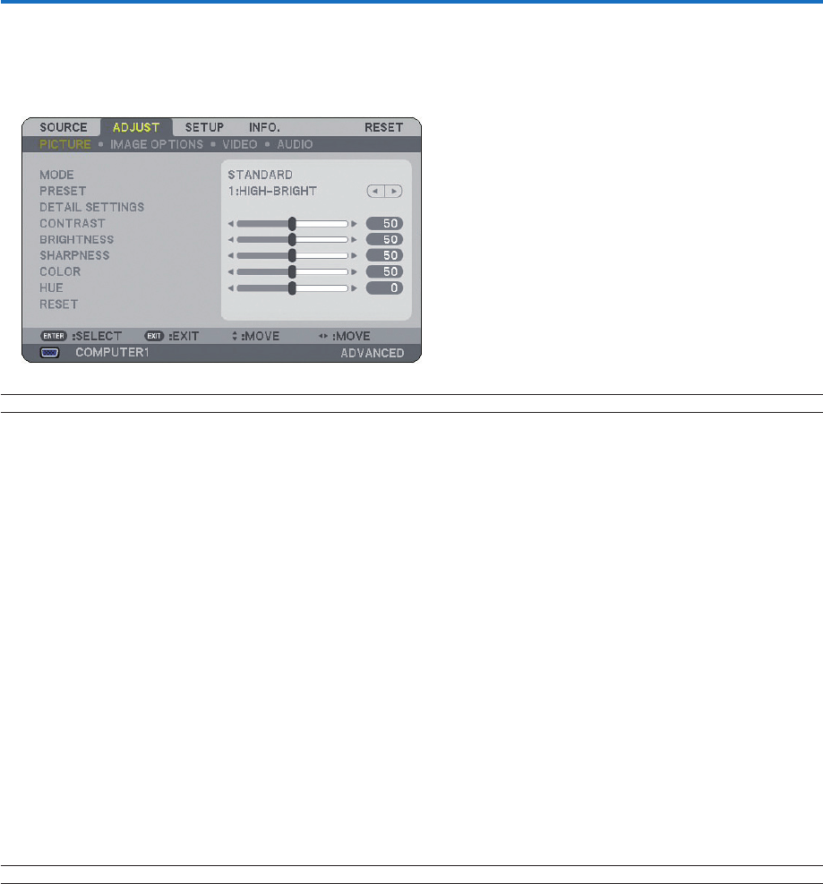 6. Adjust the level or turn the selected item on or off by using the SELECT