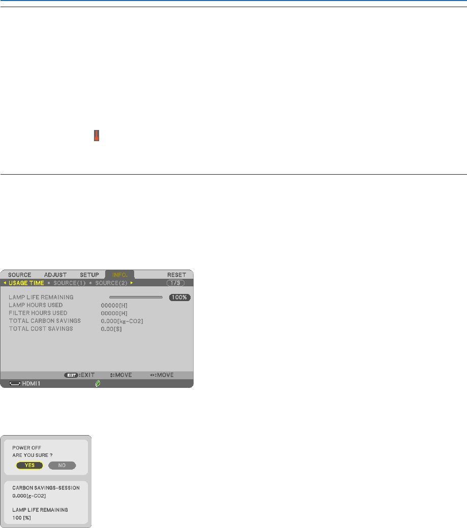 • Thelampliferemainingandlamphoursusedcanbecheckedin[USAGETIME].Select[INFO.]→[USAGETIME].
