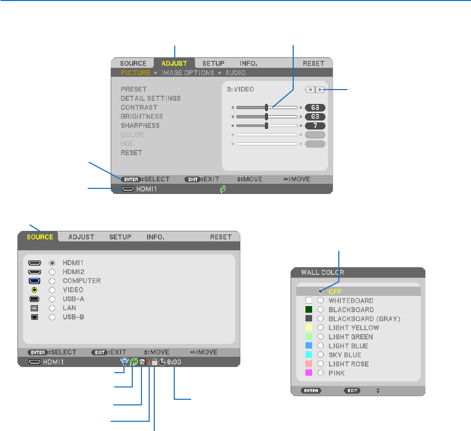 Slide bar �����������������������������Indicates settings or the direction of adjustment�