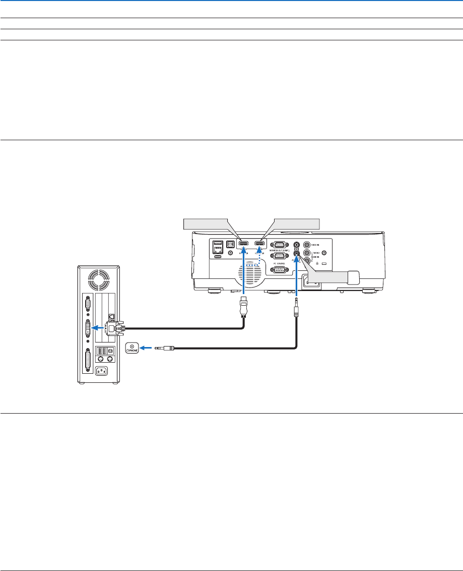 • ToprojectaDVIdigitalsignal:Connectthecables,turntheprojectoron,thenselecttheHDMIinput.Finally,turnonyourPC.