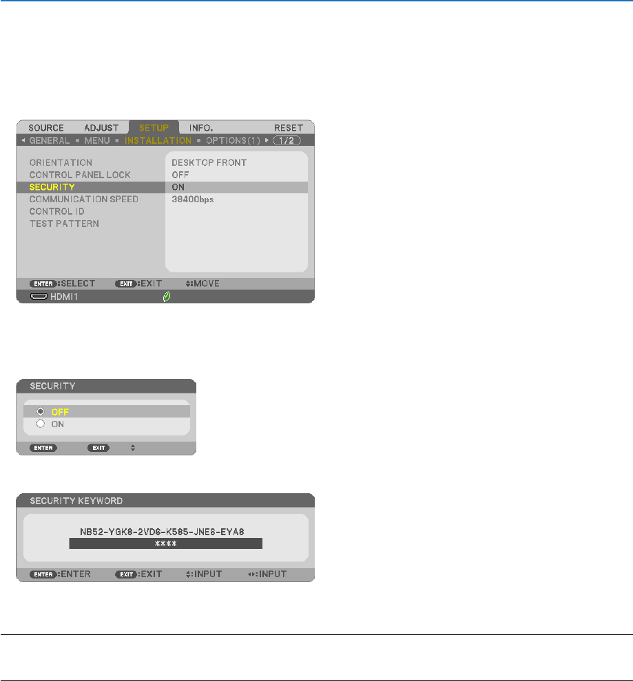 2.Select[SETUP]→[INSTALLATION]→[SECURITY]andpresstheENTERbutton.