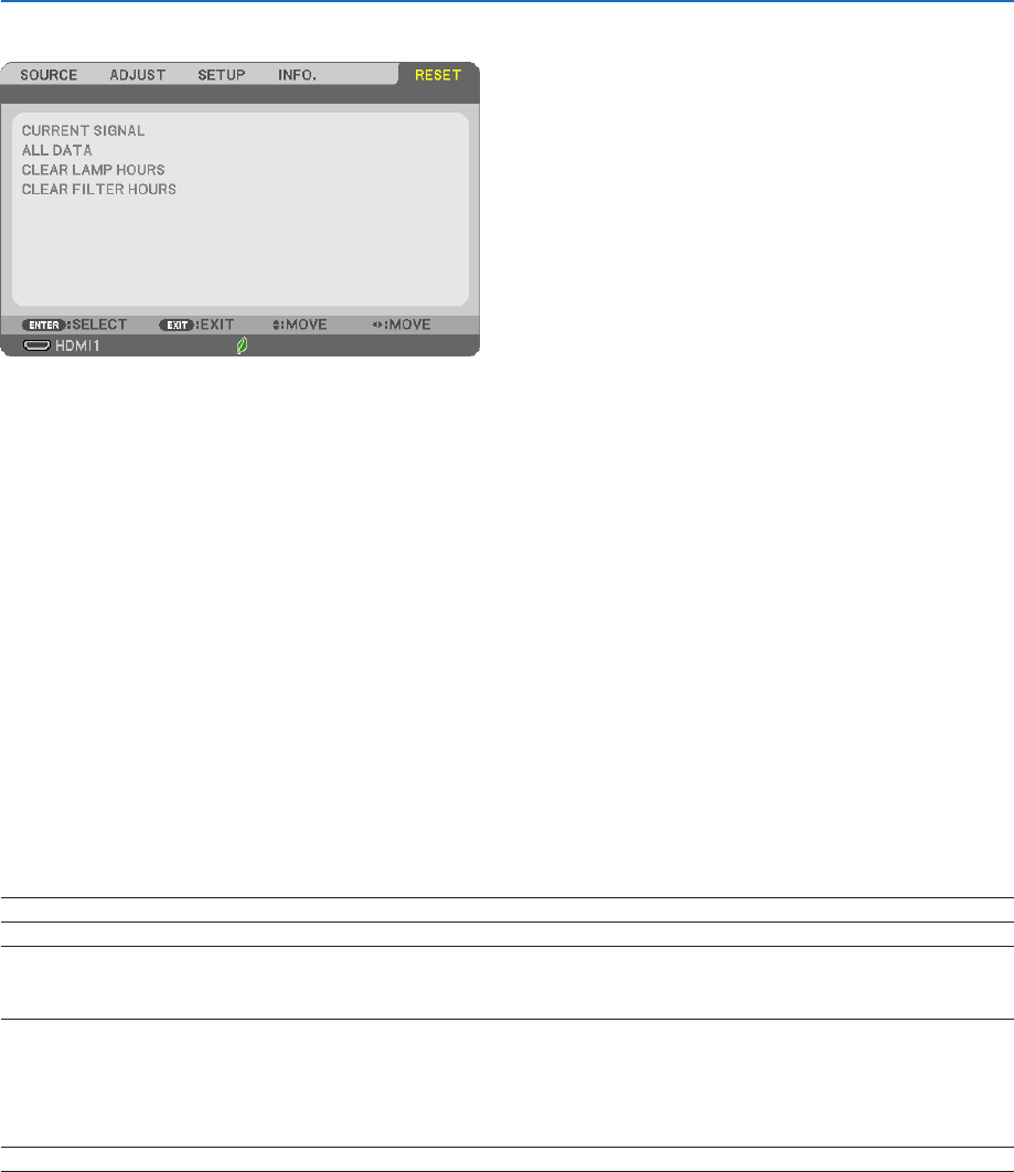 NOTE:Elapsedtimeofthelampusewillnotbeaffectedevenwhen[RESET]isdonefromthemenu.