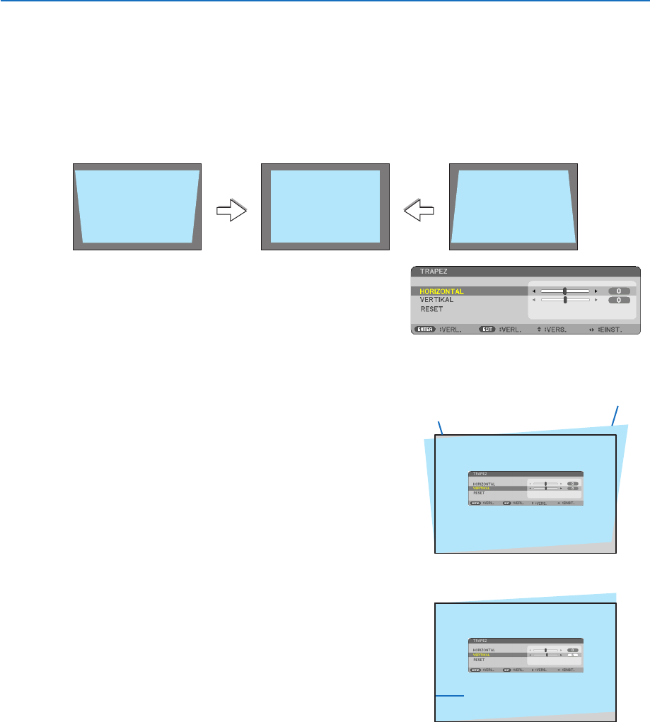 WennderProjektornichtgenaulotrechtzumBildschirmsteht,tritteineTrapezverzerrungauf.Umdieszubeheben,