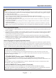 User Controls OPTIONS | ADVANCED Power-Saving mode will disable the following connectors, buttons or functions when the projector is in standby: - AUDIO OUT connector - LAN and Mail Alert functions - Buttons other than POWER button on the cabinet - Buttons other than POWER ON button on the remote control - PC Control connector - Virtual Remote Tool, PC Control Utility Pro 4/PC Control Utility Pro 5 English ... 54 STANDBY MODE POWER-SAVING: Choose “POWER-SAVING” to save power dissipation further < 0.