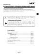 壁挂式装置 NP01WK 安装与调试手册 感谢您选购此 NEC 壁挂式装置。 请务必仔细阅读本安装与调试手册,以确保正确使用本产品。 壁挂式装置 NP01WK 仅适用于 型号 NP-U300X+/NP-U250X+/NP-U310W+/NP-U260W+ 投影 机,而无法用于其他投影机。 安装投影机必须具备特殊的技能。 客户切勿执行此作业。 致经销商和安装人员 为确保客户安全,我们要求应特别注意安装位置的牢固性,以确保 安装位置可承受投影机和安装硬件的重量后,再开始安装工作。 目录 安全注意事项...............................................................................CHI-2 准备工作.......................................................................................CHI-4 封装部件........................................................................