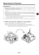 c Align the projector adapter with the holes on the bottom of the projector and securely attach the adapter with the four supplied screws (M4x20). d Loosen the vertical adjust/arm fixation knobs of the projector adapter. Caution Do not try to attach the projector adapter without the foam packing spacers in place. Otherwise the mirror section may be subject to excessive force, which can lead to a shift in the projected image and cause serious damage.