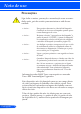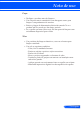 Apêndices Problema: A imagem tem uma barra vertical piscando Use “Relógio” para fazer um ajuste. Verifique e reconfigure o modo de exibição da placa gráfica para torná-la compatível com o projetor. Problema: A imagem está fora de foco Ajuste a Alavanca de Foco na lente do projetor. Assegure-se que a tela de projeção esteja entre a distância requerida 5”a 12”/130 para 314 mm [U300X/U250X]/6” a 12”/148 para 311 mm [U310W/U260W] a partir do projetor (consulte a página 29).