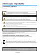 Informação Importante Sobre o modo Alta Altitude • Defina o [Modo Ventilador] em [Alto] quando usar o projector em altitudes de aproximadamente 2500 pés/760 metros ou superiores. • Usar o projector em altitudes de aproximadamente 2500 pés/760 metros sem definir [Alto] pode provocar sobreaquecimento do projector e o protector pode desligar-se. Se tal acontecer, aguarde alguns minutos e ligue novamente o projector.