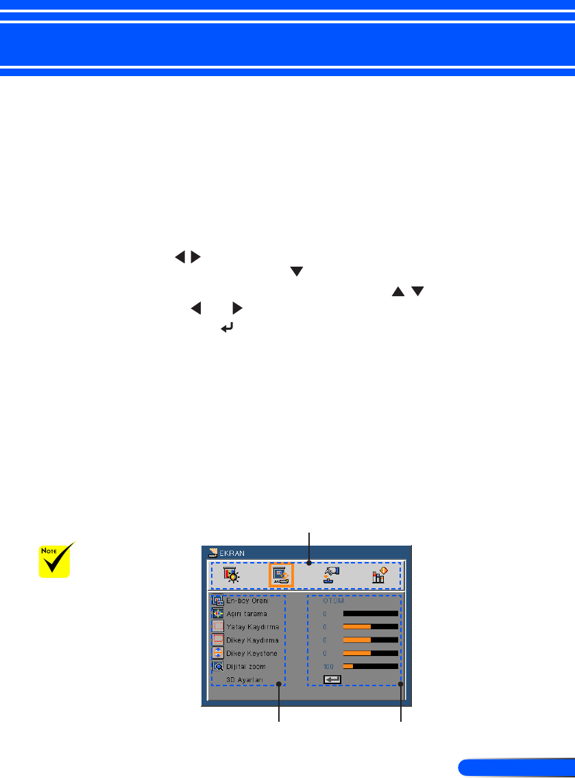 Projektörde, görüntü ayarlarını yapmanızı ve çeşitli ayarları