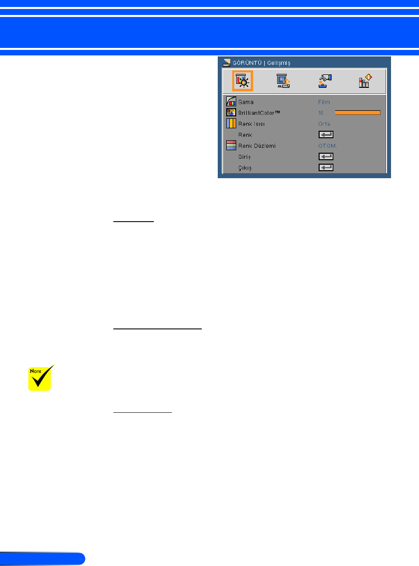 ayarı yapılan gama tablosunu seçmenize olanak sağlar.