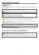 Important Information Safety Cautions Precautions Please read this manual carefully before using your NEC NP3200/NP2200/NP1200 projector and keep the manual handy for future reference. CAUTION To turn off main power, be sure to remove the plug from power outlet. The power outlet socket should be installed as near to the equipment as possible, and should be easily accessible. CAUTION TO PREVENT SHOCK, DO NOT OPEN THE CABINET. THERE ARE HIGH-VOLTAGE COMPONENTS INSIDE.