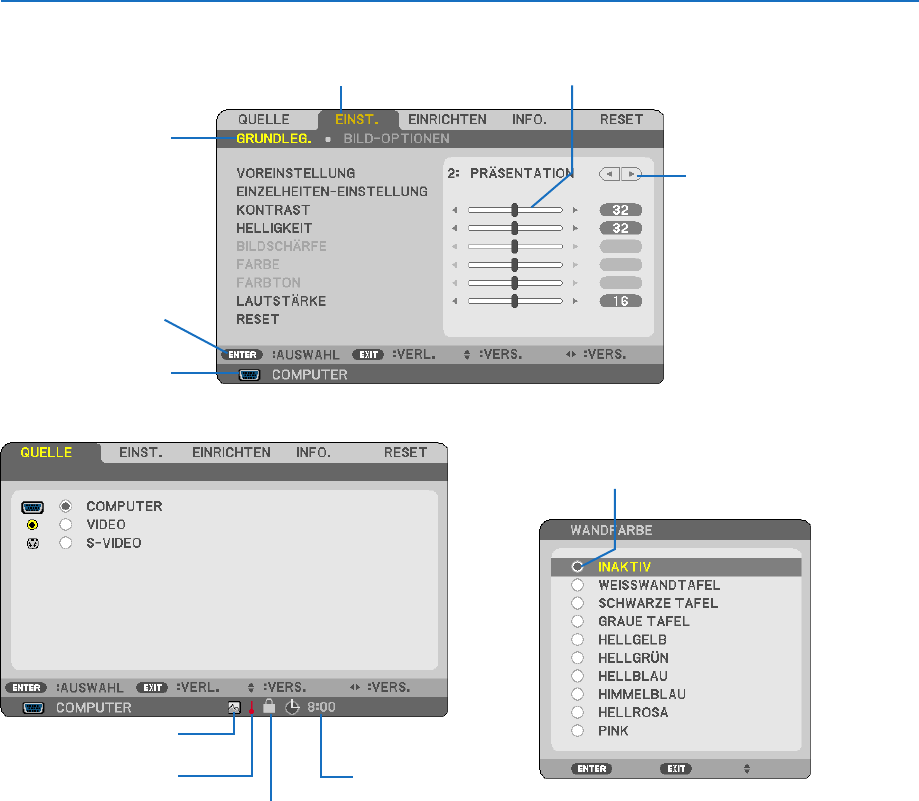 Hervorheben .....................Zeigt das ausgewählte Menü oder die ausgewählte Option an.