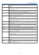 9. Appendix Troubleshooting This section helps you resolve problems you may encounter while setting up or using the projector. Indicator Messages Power Indicator Indicator Condition Off Blinking light Blue 0.5 sec On, 0.5 sec Off 2.5 sec On, 0.5 sec Off Steady light Blue Orange Red Projector Condition The main power is off The projector is getting ready to turn on. – Wait for a moment. Note Off Timer is enabled. – – The projector is turned on.